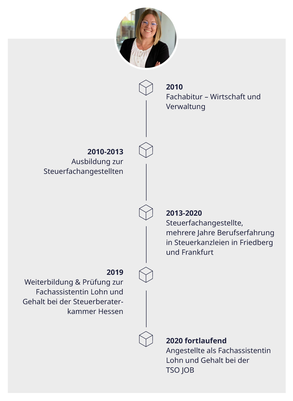 wie ich so gerne sage. Mein Name ist Laura Ebner und ich bin seit Tag Eins bei der TSO JOB dabei. Bevor ich mich vollkommen dem Bereich Lohn gewidmet habe, war ich mehrere Jahre als Steuerfachangestellte in den Bereichen Lohn und Finanzbuchhaltung in Kanzleien tätig. Durch meine Fortbildung zur Fachassistentin Lohn und Gehalt wurde mein Schwerpunkt klar definiert. Die TSO JOB ist daher für mich die perfekte Wahl, da ich hier mein Fachwissen und Leidenschaft zu 100% ausleben darf. Privat lese ich gerne und verbringe die Zeit mit den wichtigsten Menschen, meine Familie und Freunde.